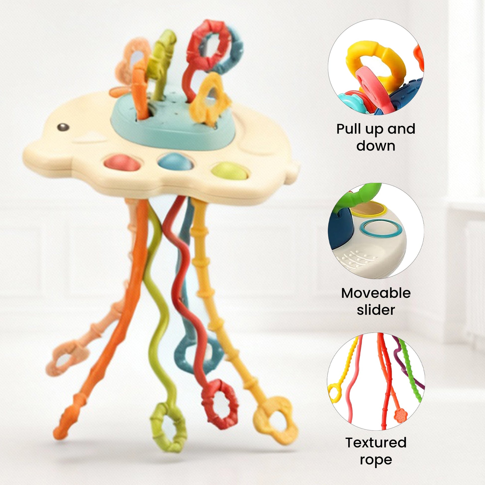 ✔ Six Textured Pull Strings: Each rope offers different resistance, vibrations, and sounds to stimulate sensory development.
